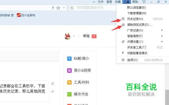 首先我们在右上角找到“工具”(可能其他浏览器的位置不一样),然后点击工具下的“历史记录”。