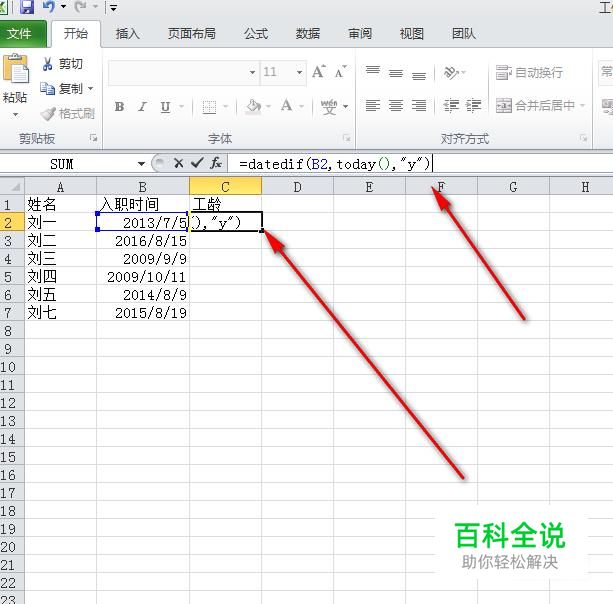 接着我们定位在工龄所在列的第一个单元格,然后在编辑栏输入函数datedif。Datedif第一个参数是入职时间,第二个today()得到的是当前的日期,第三个参数表示返回的是以年为单位的数值。