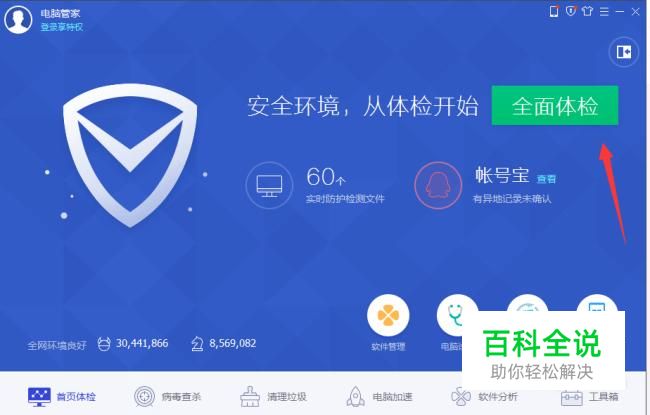 安装完成电脑管家之后将管家打开,首先电脑管家会对电脑进首次的电脑扫描,等扫描结束之后,就可进入下一步