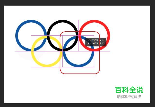 使用“移动工具”将“图层1 副本1”的圆环移动到“黑色圆环”和“红色圆环”的下方,同时保证其圆的顶点通过上面两个圆环的相切点,如图所示。