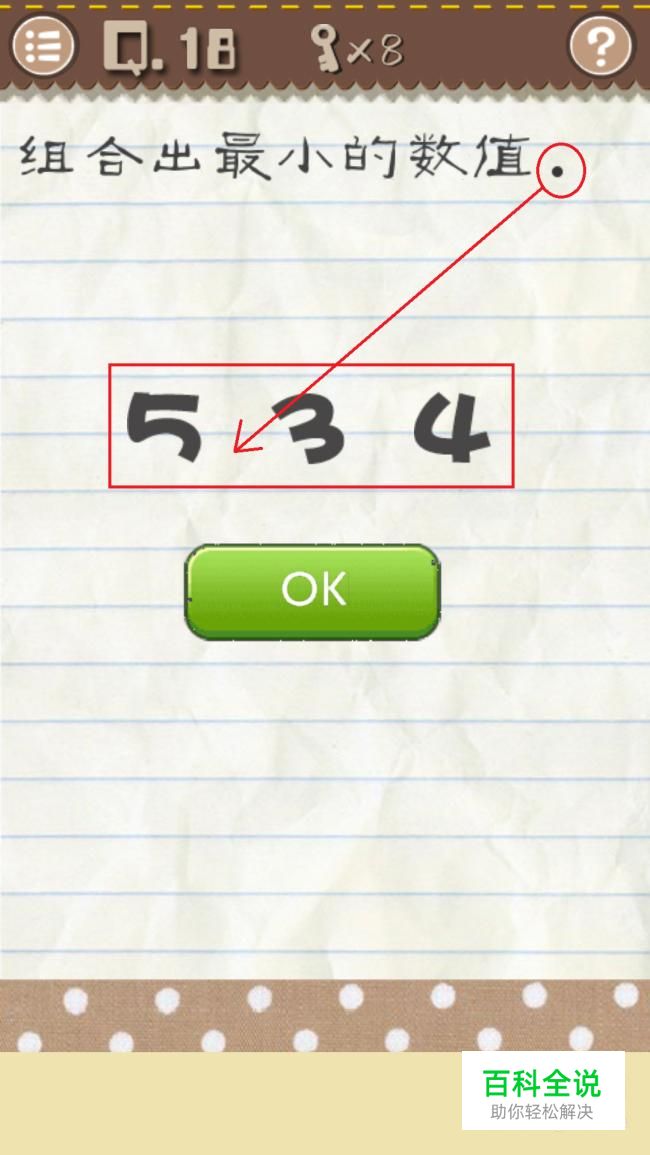 第十八关,让我们组合最小的数,我们不但要将图中的数字调换位置,我们还要物尽其用,图中还有一个小数点哦,我们组合成“3.45”才是最小的。