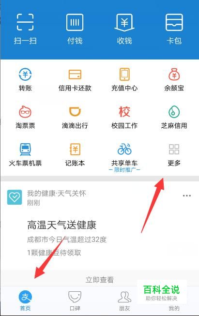 打开支付宝,在首页点击“更多”。