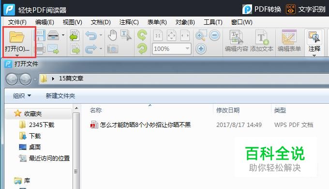 之后将你想要添加背景的pdf文件在pdf阅读器中打开,你可以点软件上方的打开按钮就可以了。