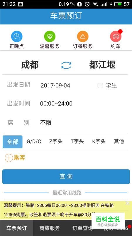 进入12306APP界面,选择出发地和目的地,确认日期和时间,点击“查询”