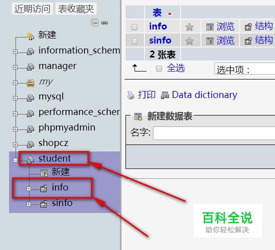 如图,在mysql数据库服务器里面新建一个数据库和数据表,待会用到,如图我就新建了一个student数据库,info数据表。