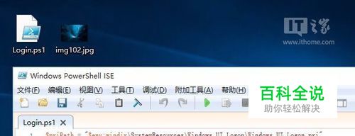 自定义背景图: 首先下载PowerShell程序文件(点此下载)。 下载后解压得到Login.ps1文件,把它复制到桌面中,再准备好一张你想更换的图片也放到桌面(支持jpg、png格式),假设这张图片名为img102.jpg(注意系统默认没有显示文件后缀名)。 右键单击Login.ps1文件,选择“编辑”,系统会自动用PowerShell ISE打开,如下图所示。这里面我们只需要修改第三行,把其中的文件名修改为自己准备好的图片文件名即可。编辑好后,保存。 右键单击Login.ps1文件,选择“使用PowerShell运行”,此时会弹出PS运行窗口,稍等片刻窗口消失后就会在桌面生成我们想要的Windows.UI.Logon_new.pri文件,把它重命名为Windows.UI.Logon.pri。