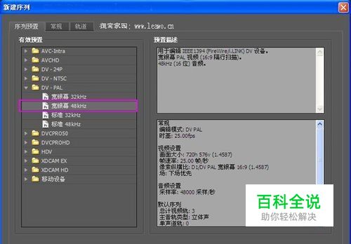 运行软件,点击新建按钮,选择工程文件的储存位置,并命名,这里命名为用照片制作mv,再点击确定。进入到了新建序列的窗口,有效预置选择DV — PAL 宽银幕48KHz,右边有对应的视频参数,给序列命名为用照片制作mv,点击确定即可进入软件的操作主界面。