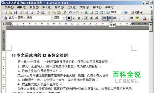 第1步,打开Word2003文档窗口,将插入点光标定位到标题所在段落中的任意位置,或者选中标题所在段落。在“格式”工具栏上单击“居中”按钮即可将标题居中,如图2009111301所示。 图2009111301 单击“居中”按钮