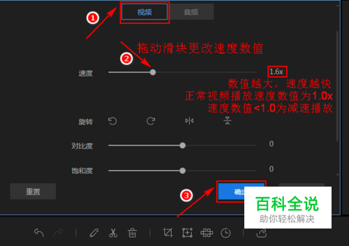 拖动速度上的移动滑块更改速度数值。速度数值越大,播放速度越快,视频正常播放情况下速度数值为1.0x,速度数值小于1.0x时为减速播放。调整好速度数值后点击“确定”按钮。