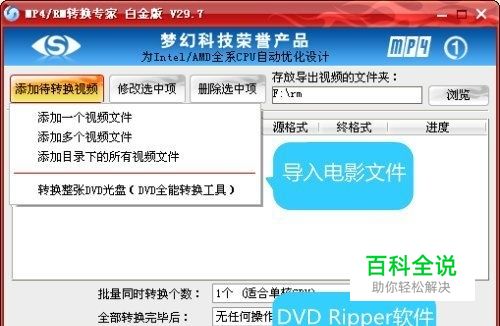 将下载的视频导入到MP4/RM转换专家 我们可以先试试视频直接放到手机上能不能播放,如果不能,说明就需要进行转换了。在MP4/RM转换专家左上角点击“添加待转换视频”按钮,导入要转换的视频文件。除了支持导入视频文件,由图可以看到右下角还有“DVD全能转换工具”,这一工具支持将DVD光盘的视频资源转换成手机、iPod、iPhone、PSP、PS3等支持的AVI、MP4、3GP等视频文件。可见功能齐全而强大。