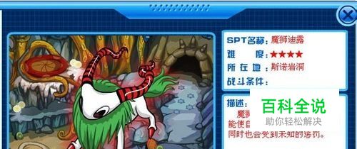 战法三:普通的攻击只能打到BOSS三千到一万多的血,造成的伤害极少。对BOSS最后效的攻击手段是巴鲁斯的漩涡,100%的特殊攻击,每次能够造成30多万的伤害。以此类推,只要是拥有这种100%的特殊攻击的精灵都可以对魔狮迪露造成客观的伤害。 第一次打败魔狮迪露,可以获得魔狮迪露的精元,并得到“击败魔狮迪露”的成就。用分子转化器进行孵化,24小时后可以得到精灵露露。