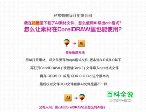 总结的其他经验:1、把AI转换成PSD格式,然后再导入CD中2、CD X3可以打开AI CS以下的AI文件及EPS文件,效果和渐变除外提供一个快速小窍门(把AI文件-转曲-另存为.WMF文件)这样就可以直接用coreldraw打开已上是普通转换,要完美(转换)参看下面方法。AI转CDR:1、CD12可以打开AI10及以下版本的文件。[效果和网格填色除外]2、CD9可以打开AI7及以下版本的文件。 [效果和网格填色除外]3、AI10文件和以下版本的文件最好在AI10软件保存,高版本导出的AI10可能在CD中不兼容。总结得出,AI11及以上版本的AI文件,导出成AI10及以下版本即可在CD12或9中打开。能支持的功能有填色、渐变,蒙板将自动删除蒙板以外的物件、图案填充将被打散。效果和网格还未偿试到更好的导出方法。4、把AI转换成PSD格式,然后再导入CD中。5、CD X3可以打开AI CS以下的AI文件及EPS文件,效果和渐变除外!6、CDR12 可以另存为AI 格式的,就是存前要转曲线!效果很好.问题:cdr12打开AI文件为什么会提示文件被损坏?怎么解决?这跟内容有很大关系,比如都是简单的线条,问题就不大了,AI的文件要用CDR打开,可以另存为EPS 8.0版本,CDR的文件要用AI打开,可以另存为AI就OK了。CDR转AI:AI不可以直接打开CDR,扩展—保存为CS格式—导入到CD13—保存为CD8格式,此方法绝对可行。AI转CDR:AI文件--转曲--另存为--.WMF文件,这样就可以直接用coreldraw打开Ai文件。 (此为普通转换)1、CD9可以打开AI7及以下版本的文件。 (效果和网格填色除外)2、CD12可以打开AI10及以下版本的文件。(效果和网格填色除外)3、CD X3可以打开AI CS以下的AI文件及EPS文件。(效果和渐变除外)4、AI11及以上版本的AI文件,导出成AI10及以下版本即可在CD12或9中打开。能支持的功能有填色、渐变,蒙板将自动删除蒙板以外的物件、图案填充将被打散。5、把AI转换成PSD格式,然后再导入CD中。(测试结果:此为图片格式,内容不可修改?)6、AI文件另存为EPS 8.0版本,即可用CD打开。虽然效果消失,但全部内容均可修改。不错。AI或EPS文件完美导出成PSD分层文件的方法:注意,这是目前PS或CD使用AI文件,达到最佳颜色的好途径。算是半原创吧,有些内容是引用人家的,但不精确,我就再罗嗦几句。第一:你要准备ILLUSTRATOR软件,建议是AI11即AICS1以上的版本。第二:你的AI矢量文件或EPS文件,想导出完全分层还是一个图层,取决于你在下面的图中的设置。现在我们打开一个AI或EPS矢量图。文件导出后,在PS中打开:
