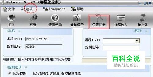 3、注册和登录 为增强隐蔽性,程序被双击后会隐藏在后台运行,看不到软件界面,要利用热键Ctrl+Y呼出软件主界面,点击软件界面上的“免费注册”(如图3),即可注册使用至尊会员。然后 点击软件上的“选项”,选择会员登录,输入您的会员号和登录密码,并设置好控制密码(控制密码为事后你要控制这台机器时用的密码,可与登录密码不一致)。 至少要两个至尊会员号码,才能实现隐性控制(一个装在被控电脑上,另一个是控制方使用),因此2个号码可以控制1台电脑,3个号码可以控制2台电脑,4个号码可以控制3台……(因为控制方总要占用一个号码)。