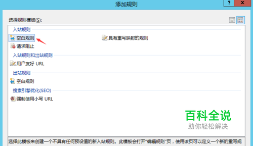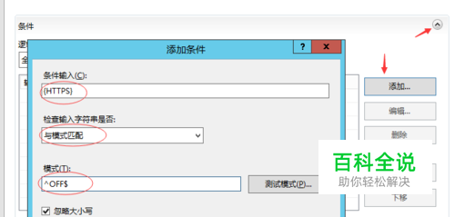 IIS 版本 使用url重定向实现全站跳转。在此之前,请检查网站根目录是否有web.config文件,如有,请先备份这里的web.config文件,因为以下的配置可能会和web.config里面跳转冲突。 1选择需要实现跳转功能的网站,双击“URL重写”,选择如下图“添加规则”。 2在弹出的对话框选择空白规则,点击确定。 3根据以下截图配置新的规则,红色框框为需要配置或注意的选项。 4展开条件选项,点击添加按钮,添加如下图条件,然后点击确定。 5再次按下图提示,添加条件,点击确定。 6选择执行操作类型,如下图。 7填写完毕,点击右上角应用,应用此规则。 8最后确定完成所有设定,实际上上面的文件是改变了网站根目录web.config的配置文件内容。 以上配置文件内容如下,可以比对 <rule name="Redirect to https"stopProcessing="true"> <match url="(.*)" /> <conditions> <add input="{HTTPS}" pattern="^OFF$" /> <add input="{HTTPS_HOST}" pattern="^(localhost)"negate="true" /> </conditions> <action type="Redirect"url="https://{HTTP_HOST}/{R:1}" redirectType="SeeOther"/> </rule>