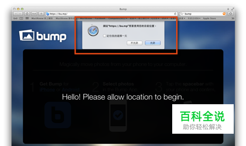 再来,用那台要接收照片的电脑,开启浏览器(应该各浏览器都可以),连结到:https://bu.mp/ 开启浏览器之后,例如Safari会跳出说,Bump想要存取你的位置资讯,请按下“允许”。