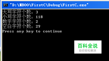 C语言的字符是整型类型,在处理八位字符时,有一些是需要我们记住的,并且其中有一些是有规律的。 十进制 十六进制 意义 0 0 \0空(NULL)通常表示字符串的结束,在指针中表示指针没有指向空间 7 7 \a响铃 8 8 \b退格键(backspace) 9 9 \t水平制表符 10 A \n换行符 13 D \r回车符 32 20 空格 其他的就是字符了,包括a-z,A-Z,0-9等等。大小写的规律是大写字符+32等于对应的大写字符。这个规律可以用于大小写转换。 c语言提供了几个处理字符的函数: isalnum测试字符是否为字符或数字 isalpha判断字符是否为字符 isdigit判断字符是否为数字 isspace判断字符为空白字符:空格 \t \n \r \v \f isupper判断为大写字符 islower判断为小写字符 好我们利用这些字符函数来进行一段字符串的统计,简单一点,统计大写字符个数,小写字符个数,数字字符个数和空白字符的个数。 代码如下: //统计变量 int upperCharCount,lowerCharCount,spaceCharCount,numCharCount; int count = 0;//字符串的个数 int i;//索引 char str[] = "1 My father was a self-taught mandolin player.2 He was one of the best string instrument players in our town. He could not read music, but if he heard a tune "; upperCharCount=lowerCharCount=spaceCharCount=numCharCount=0; count = strlen(str); for(i=0;i<count;i++) { if(isupper(str[i])) { upperCharCount++; continue;//如果是大写字符,记录,执行下一次循环 } if(islower(str[i])) { lowerCharCount++; continue; } if(isdigit(str[i])) { numCharCount++; continue; } if(isspace(str[i])) { spaceCharCount++; continue; } } //打印各种字符类型的个数 printf("大写字符个数:%d\n",upperCharCount); printf("小写字符个数:%d\n",lowerCharCount); printf("数字字符个数:%d\n",numCharCount); printf("空白字符个数:%d\n",spaceCharCount); return 0; 显示结果: 字符介绍到这里,希望对您有用。
