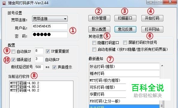猎金多开器设置方法 ①:宽带链接:写上自己的宽带和密码 ②:软件管理:可以查看当前有资源项目,并可直接下载和运行打码软件 ③:扫描窗口:将当前所运行的所有打码软件的窗口进行扫描 ④:开始打码:扫描窗口之后,按此键开始工作 ⑤:默认配置:将多开器的设置恢复初始值 ⑥:打开网址:打开猎金网主页 ⑦:最新通知:会公布一些打码的最新消息 ⑧:当前运行软件:在按下“扫描窗口”之后,会在此栏显示当前被扫描的所有打码软件窗口 ⑨:自动更换IP功能:可选择是否启动,√表示开启,反选表示禁止自动更换IP。数量可以根据自己习惯填写,填“8”,表示打8此码换IP ⑩:错误警告:当打码过程中,连续错误超过所填写数字的次数时,会弹窗进行提醒。此时更换IP