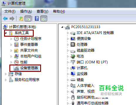 开计算机管理,在“系统工具”中找到“设备管理器”项,如图所示: