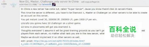 ThePowerOfAura:听起来真不错,但是中国有13亿人口,我觉得他们的英雄联盟玩家会比世界剩下的国家加起来还要多。 └--->nrocksteady:然而世界剩下的国家有57亿人。 └--->ThePowerOfAura:中国有大概10个或者更多的服务器,他们是唯一做到这样的地区。这个服务器的玩家应该也会上万,而对于北美来说运行一个只容许1000名王者级别的玩家的服务器没有必要。在欧洲有类似的EUW服务器,而在亚洲,很长时间以来,韩国的服务器担当了这项任务。但是现在韩国赛区正在封锁中国玩家取得他们服务器的账号,所以他们在建立属于自己的头等服务器。我知道你只是想胡搅蛮缠,但是你真的没有理解到为什么中国需要/可以推出一个超级专区。