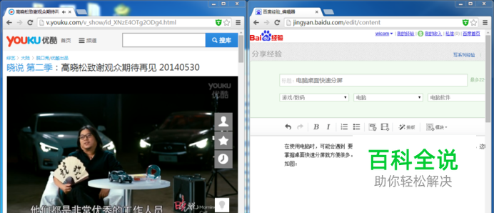在使用电脑时,可能会遇到 要同时查看两个文档,或者想一边看视频,一边浏览新闻,这时如果掌握桌面快速分屏就方便很多。 如图:边看视频,边写分享。 实现步骤: 1.打开视频 2.同时按下键盘上面win键和向左方向键(左方向键即占桌面左半侧,右方向键即占桌面右半侧) win键即键盘上面键盘 3.再打开一个窗口,同时按下win键盘上面win键和向右方向键 总结: 无论是浏览器或word等或者其他各种软件,只要按上面操作均可实现桌面分屏效果。