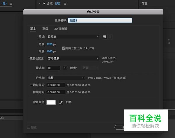 进入AE软件之后新建一个合成,帧速率我们一般设置为30f。