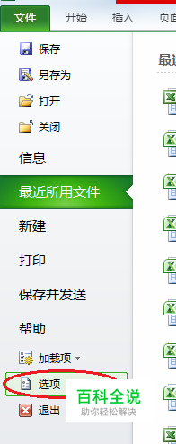 首先要进入Excel主界面。单击主界面左上角的“文件”选项卡,在如图列表中单击“选项”。