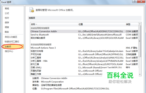 这时会弹出“Excel选项”对话框,在对话框中单击“加载项”。在对话框中的“管理”下拉列表中选择“Excel加载项”(一般默认情况下不用选择),然后再点击如图所示的“转到”命令。