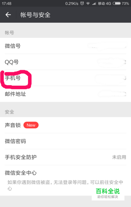 打开设置后选择“账号与安全”,这时就会看到自己微信号的各种信息,点击一下“手机号”。