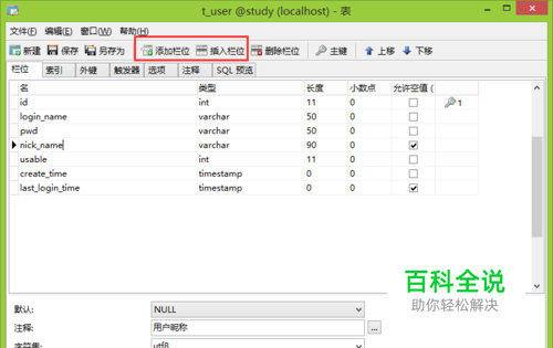 然后点击添加栏位,会在表字段最后添加空白行。如果你不想把新增的字段放在最后面,可以先选择一个字段,然后点击插入栏位,即可在刚刚选择的字段前插入一个空行。