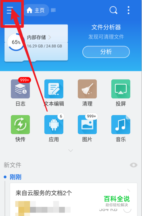 首先打开ES文件浏览器,点击左上角【三横】;如图所示