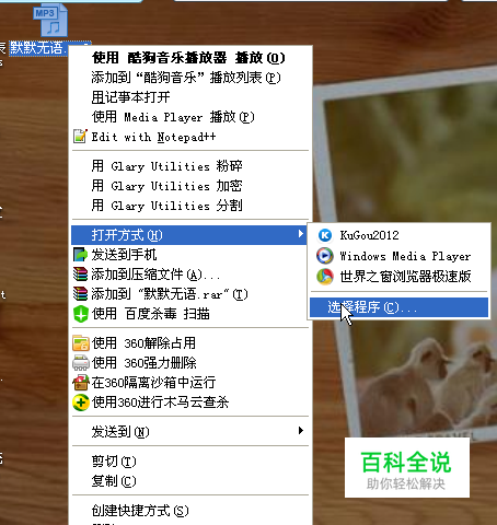 选择一种程序,比如是音乐文件,就选择酷狗之类的音乐程序。选择完毕之后,在下面勾选“始终使用默认的程序打开这种文件”。这样一来,以后只要双击文件就会用默认的程序打开文件了。