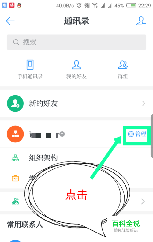 点击后打开通讯录界面,点击要集散的学习组织右边的管理选项。如图所示