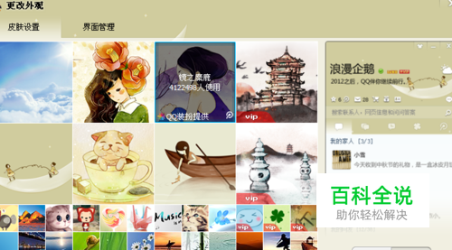 在界面管理器页面上点击皮肤设置,鼠标单击你喜欢的图片,这时就可以看见QQ页面的背景图也换了。
