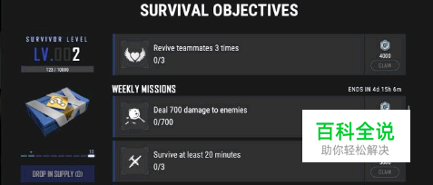因此,此次生存系统任务主要分为两种,一种为完成任务的程度,主要为资源(药品、投掷物等)的消耗,排名,击杀奖励等,另一种为游戏参与的时间,主要为游戏时间、移动距离等。