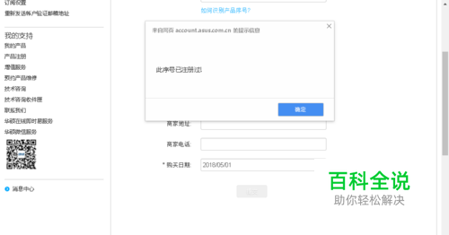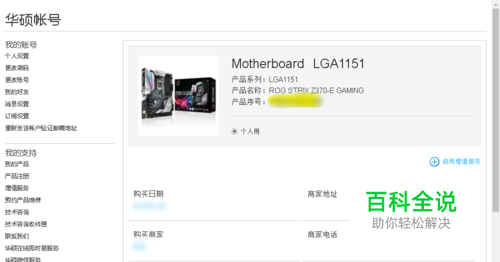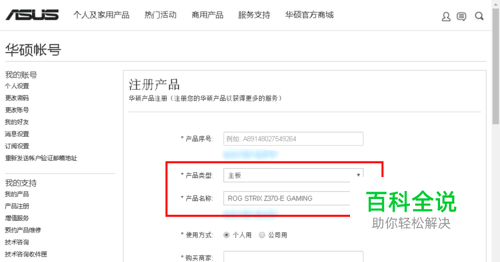 登录后在我的支持中找到"产品注册" 在产品注册页面 产品类型选择主板 产品名称选择刚刚我们查到的型号 rog z370e 产品序号就填入我们找到的序列号