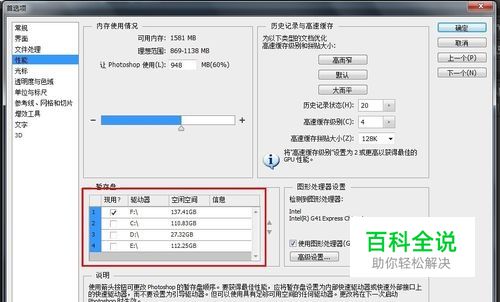 图中就是首选项对话框,注意红色框内,有一个暂存盘选项,在这里很关键了,你可以选择内存多的盘为暂存盘。