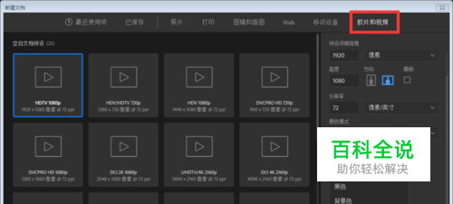 PS里选择新建画布,选择“胶片和视频”,背景色设置为透明,在左边的这些预设里可以选择与视频大小相同的预设。