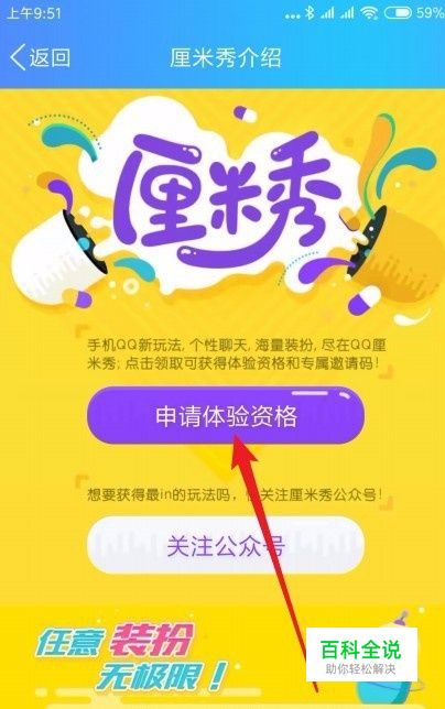 这时就会打开QQ厘米秀的页面,点击页面中的“申请体验资格”按钮。