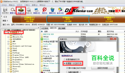 方法一:利用“diskgenius”工具来恢复分区丢失的文件。 将此文件恢复工具安装到除系统磁盘(C盘)以外的其它磁盘并运行,待完成整个电脑磁盘的检测操作后,选中“C”盘,点击“恢复文件”按钮,并在弹出“恢复文件窗口”中勾选“恢复整个分区的文件”项,点击“开始”按钮。