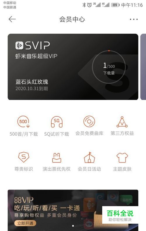 2.2点击“88会员”下拉找到虾米音乐VIP兑换项进行兑换。