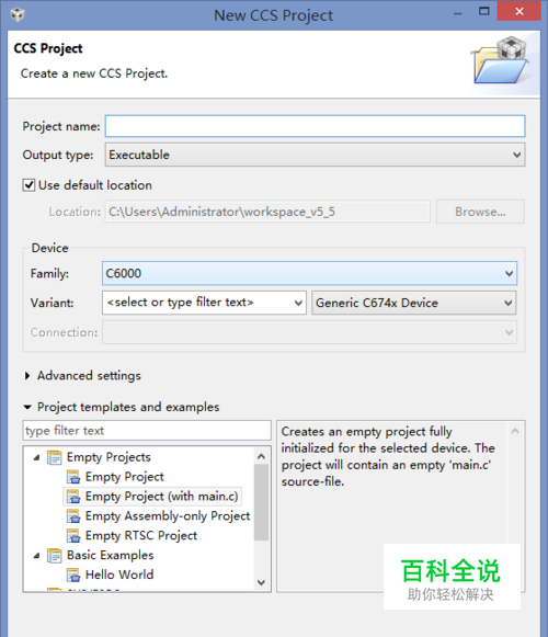 输入工程名并选择芯片型号,要建立模拟工程,这里需要选择Generic devices下的芯片。本文选择的C6000系列芯片的Generic c674x devices。再在左下方选择项目的文件,最后点击确认即可。