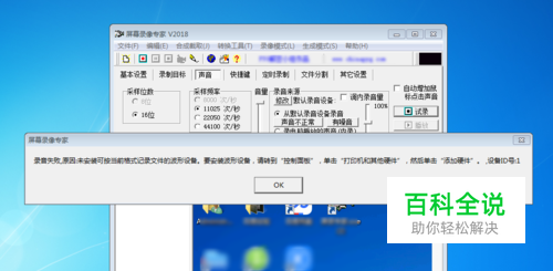 打开屏幕录像专家,点击“声音”选项,就不会出现上面出现的“录音失败,原因:未安装可按不前格式记录文件的波形设备。。。。”的提示了,经试录后,录音正常。