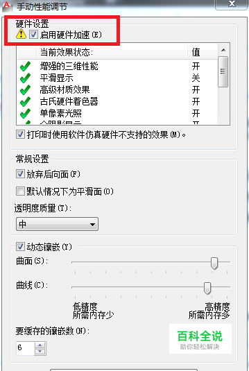 在“手动性能调节”窗口中,将“启用硬件加速”前的方框选中,如下图所示: