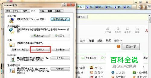 进入“Internet选项”窗口,点击“内容”,选择“证书”按钮。