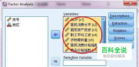 打开了因素分析对话框,将要分析的这8个变量放到variables框中,点击箭头按钮可以添加变量