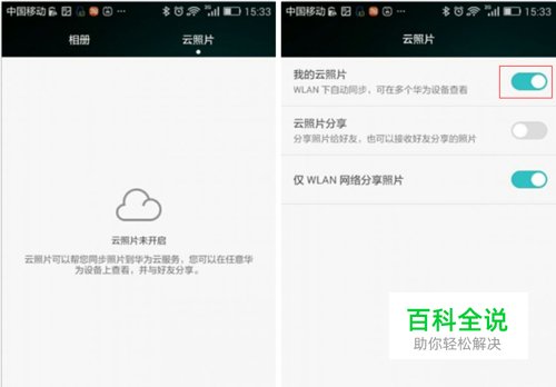 2、云照片缓存生成与删除 1)进入图库,点击“云照片”页签,开启云照片,开启“我的云照片”开关。