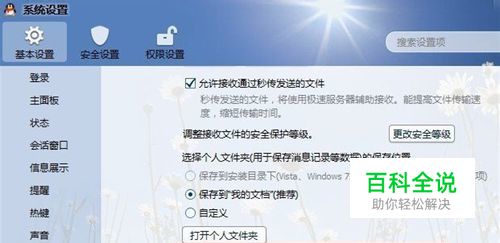 先QQ面板的---主菜单---系统设置----基本设置,进入,找到左侧的文件管理。