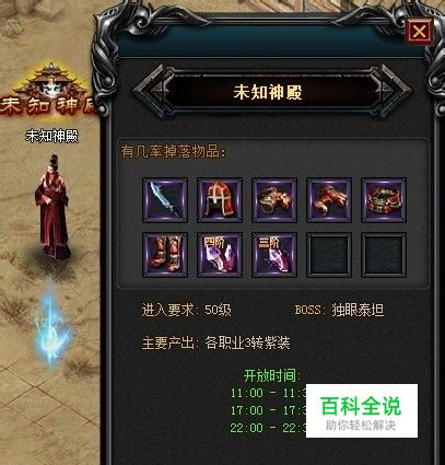 玩家参与等级:玩家等级≥50级 活动时间:每天11:00-11:30、17:00-17:30、22:00~22:30开放入口,每天开放三次 参赛奖励:大量装备和道具掉落 规则简介 活动开始后,玩家可以通过在土城NPC“未知神殿”进入活动场景: 活动场景一共分为二层,第一层全部为小BOSS,比较容易击杀,新手玩家也可以进入畅享单挑BOSS的乐趣,第二层会刷新高级BOSS,击杀后有几率掉落高级紫色装备哦,BOSS难度一般,带好了药水就可以前往一试了,第二层在活动开始15分钟后刷新出5只超级BOSS,BOSS血量和攻击都比较高,当然,掉落也是灰常丰富的,击杀后有较大几率掉落转生装备,不过难度较高,建议组队前往击杀!