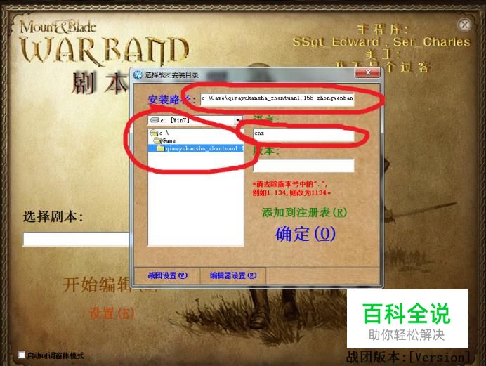 运行修改器,先选择游戏安装路径,语言栏必须填写“cns”,否则会是英文的修改器。确定选择后,再选择游戏版本,这是有时会提示无法识别游戏版本,不用管它,继续运行。