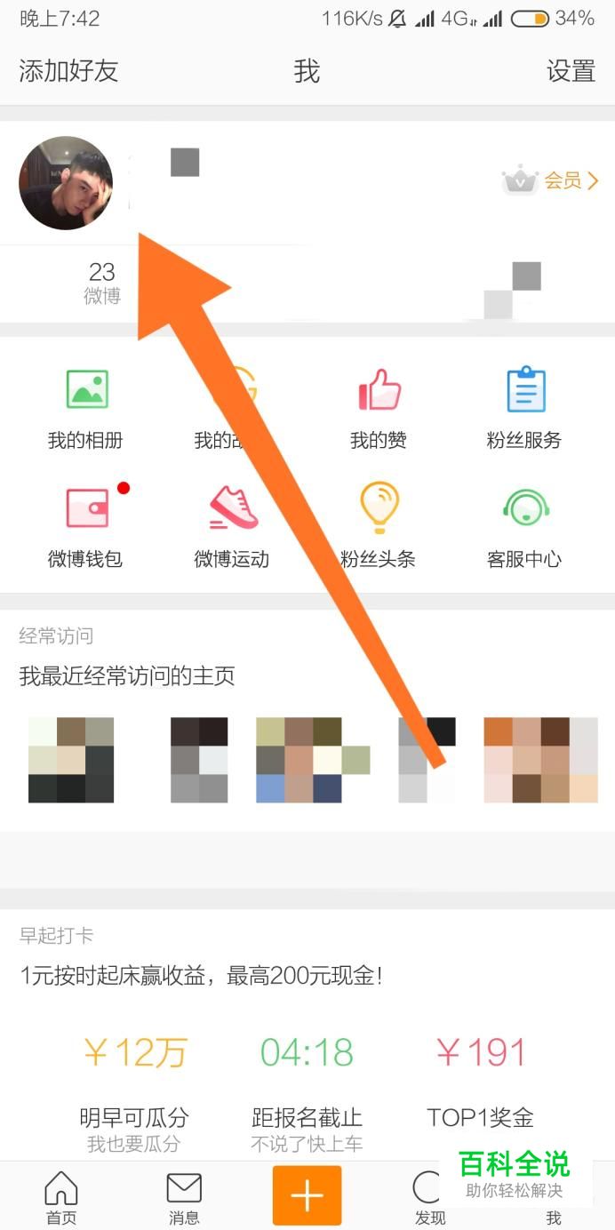 首先进入手机微博客户端页面“我”,然后点击左上角的微博头像。